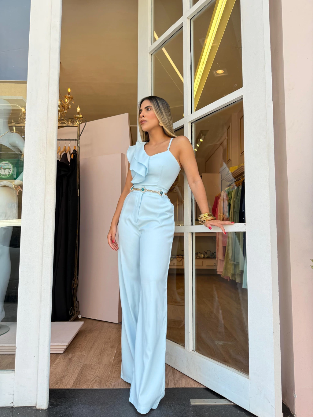 O Conjunto Penélope é a definição de elegância com leveza! Composto por uma blusa de alça com detalhe assimétrico em babado e calça de alfaiataria fluida, ele une romantismo e sofisticação em uma única produção. O tom suave traz frescor e delicadeza, perfeito para dias iluminados e ocasiões especiais.